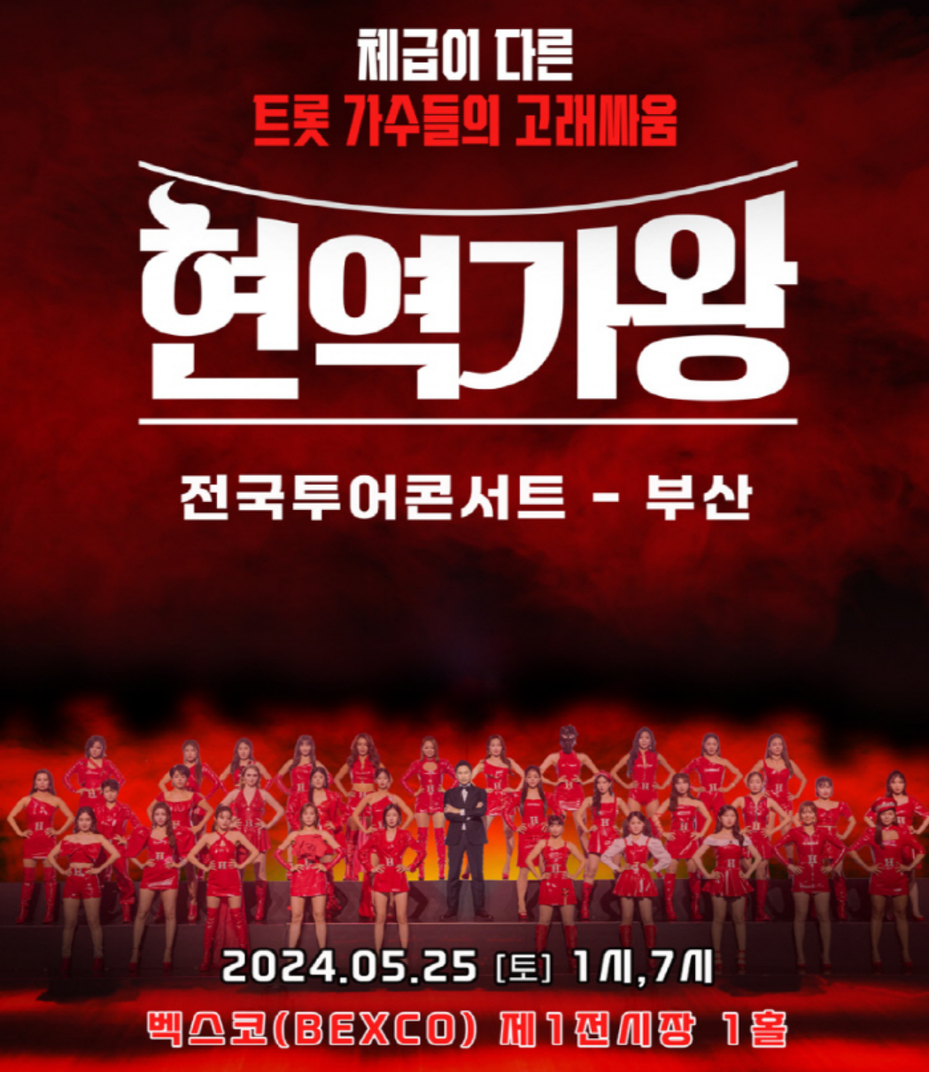 2024년 05월 25일 토요일 오후 1시 1회차, 오후 7시 2회차 백스코 제 1 전시장 1홀에서 2024 혁역가왕 전국투어 현역가왕 TOP7을 부산에서 다시 만나 보실 수 있습니다.